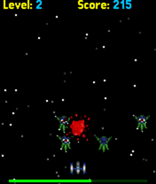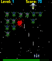 The goal of this game is annihilating aliens at each level. As the level starts several rows of aliens appear at the top of the screen and begin to move from the left to the right. Should an alien reach the right side of the screen, all of them come a bit done and starts moving to the opposite direction. The player manages a fighter, located at the bottom of the screen and armed with a laser gun. The player can both move the fighter to the right and to the left, and shoot the gun. There is a fixed amount of life-energy per each level. Enemies shoot at the player with laser too. Also from time to time an UFO flies by and drops a nuclear bomb, which annihilates the player immediately, should he be in the hitting zone. As soon as all the aliens have been annihilated the next level starts. The game is over if the player runs out of energy or at least one alien reaches the bottom of the screen.